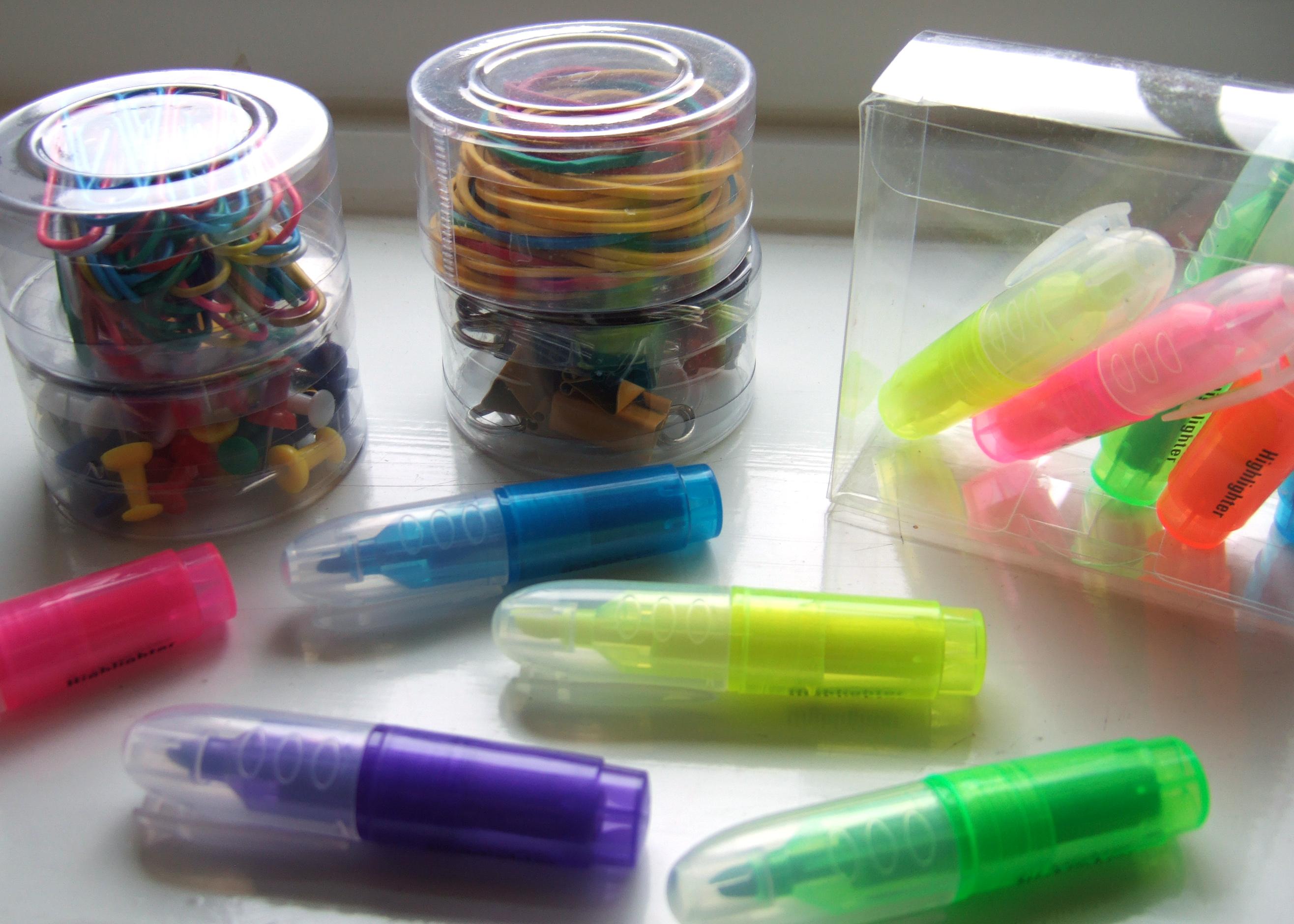 The prize today consists of a pack of 10 mini highlighters along with four little pots of clips and pins.